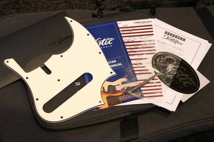 Xotic純正ギグケース、スペックシート、調整用レンチ、その他交換用のピックガード(Parchment 3P)等が付属します。